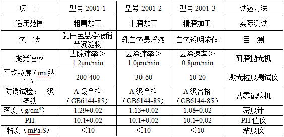 2、型號(hào):2001金屬研磨拋光液,分三種型號(hào):2001-1(粗磨),2001-2(中磨),2001-3(精磨)